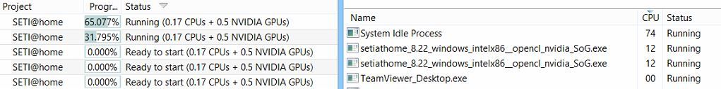 I don't know for sure but I think that AMD/ATI cards don't need as much cpu support as Nvidia cards. Look at the run_time and cpu_time of a cpu task started after the RX570 was added to the system. If the run_time matches the cpu_time I would say you don't have to make any changes. However if the run_time is much greater than the cpu_time, then the cpu is overloaded and you should drop off one cpu task via either a use at most cpu allowed setting in the Seti Compute preferences or by a <project_max_concurrent>N</project_max_concurrent> statement in an app_config file to reduce the number of cpu tasks running. Most CPU times were about 4350 seconds CPU time and 4700 seconds total time while running 4 tasks on the CPU. Does this seem pretty reasonable? Also, it shows that BOINC is using between 77-87% CPU usage under task manager while running 3 CPU tasks. I'm going to try running 3 CPU tasks and if there isn't any change in CPU and GPU times per task vs 4 tasks, I will revert back to 4 tasks. |
